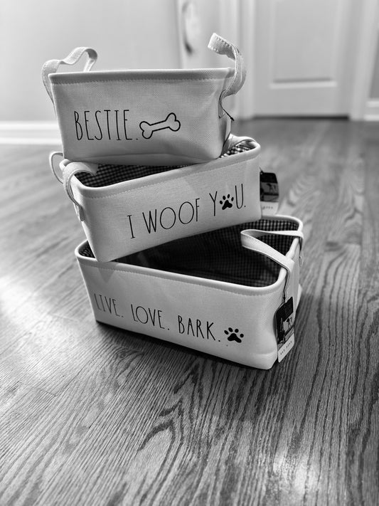 Rae Dunn "Live, Love, Bark" Set of 3 White fabric Cube Bins
