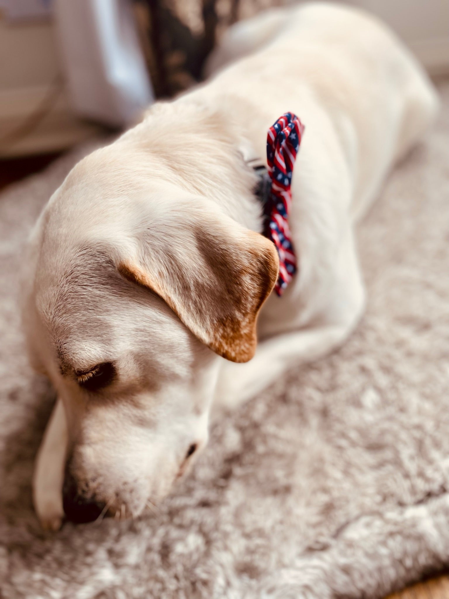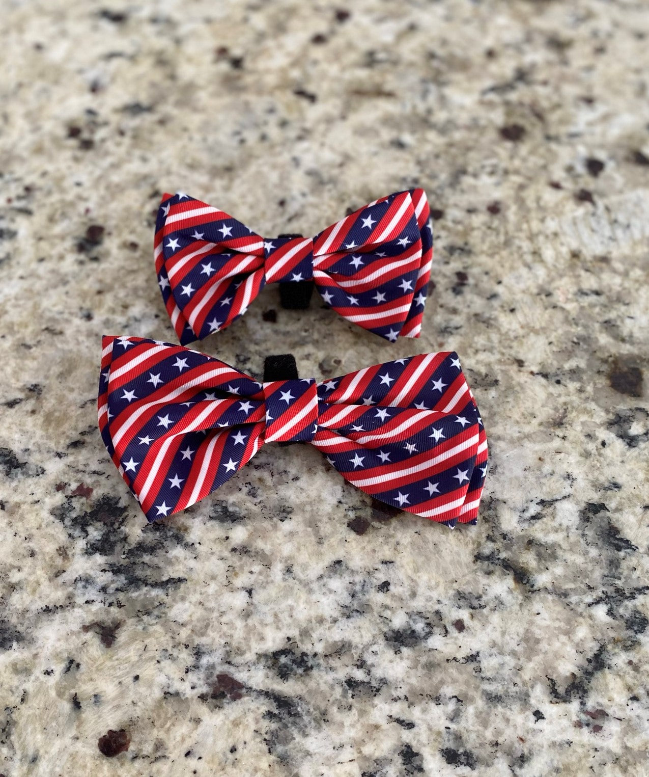 Even your pet can show American pride with this red, blue and white bow tie. Can be attached to any collar, ear or topknot with the soft hook and loop touch fastener.