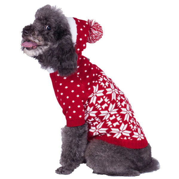 As temperature drops, you don't want to leave the style of your loved dogs out in cold. We are here to offer you a cold-weather classic - the snowflake sweater. What is so unique about this piece of holiday norm? This sweater gets an update with a slouchy and comfortable hat. You can use this sweater as a hoodie to protect your precious pooches during fall and winter time. The classy red and white snowflake festive patterns and pom detailing at top lend charm to this cozy sweater, which could not be copied anywhere else and only found with Blueberry Pet!