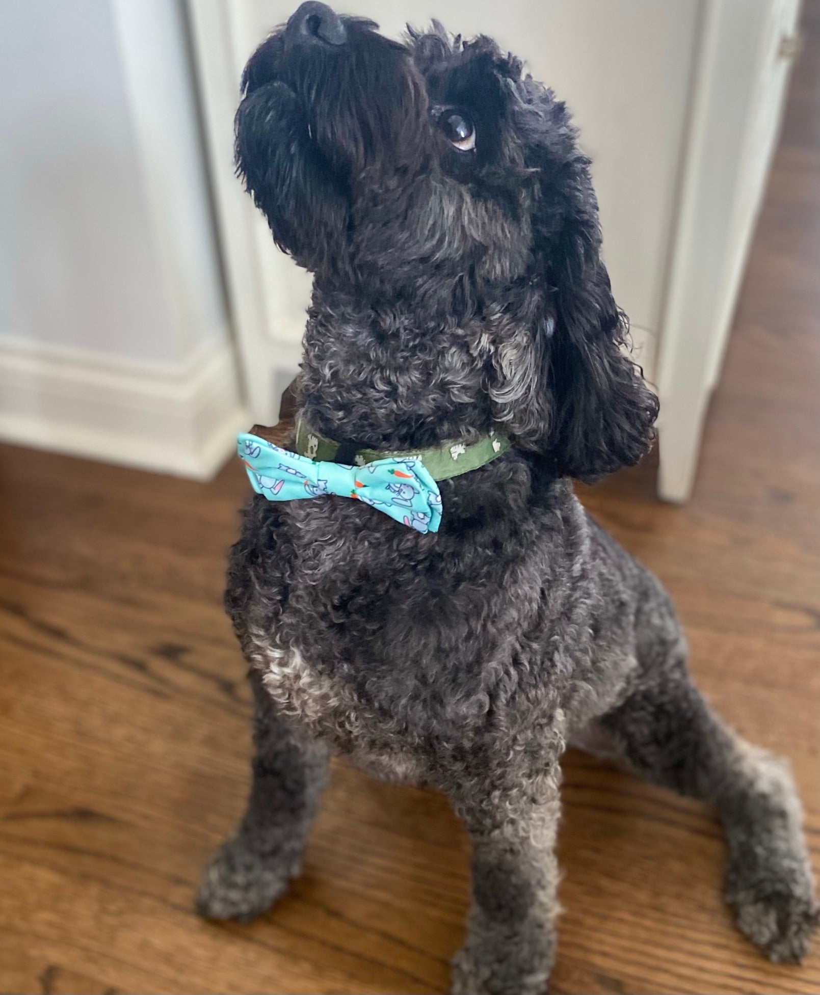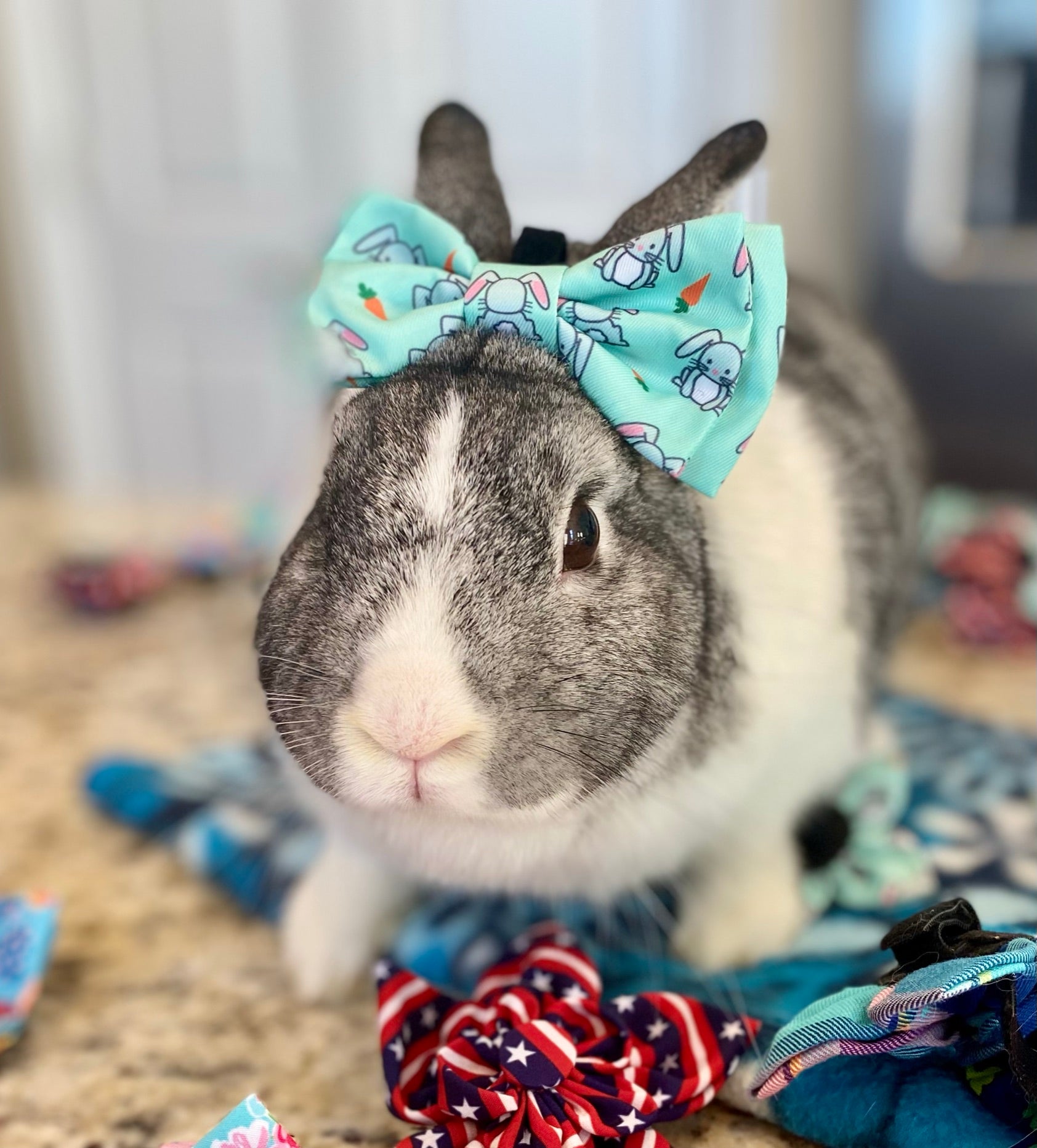Dress up your pet in this adorable rabbit bow tie. A beautiful light green background with rabbits and carrots on the bow.